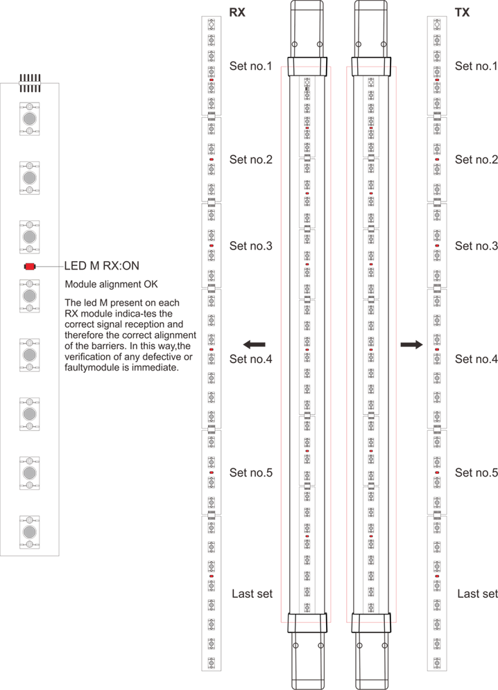 | Slow fl ashing | Switch on | Slow flashing | 1.The barrieris in alarm, make sure that the intervention area is clear. 2.Each segment (8 beams) of the RX barrier has a LED which if off indicates the module in alarm. 3.Check the alignment between the barriers. 4.Clean the elements with a soft cloth. 5.If this does not correct the fault, replace the unit. |