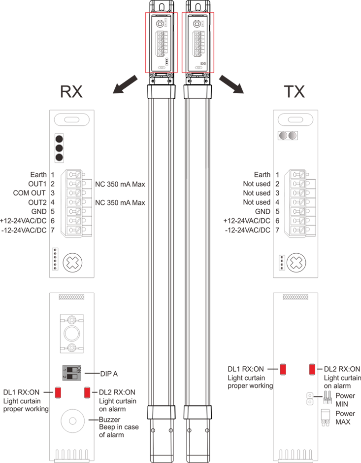 - To avoid reflections and / or reception errors, a unique identifcation code is set for each infrared beam. When an object, limb or body of a person interrupts the beam of rays emitted by the transmission unit, the output is immediately opened by the receiver unit, with consequent blocking of the automation. The system is only safe when the TEST system is used, this allows you to check the correct functioning of the barrier .