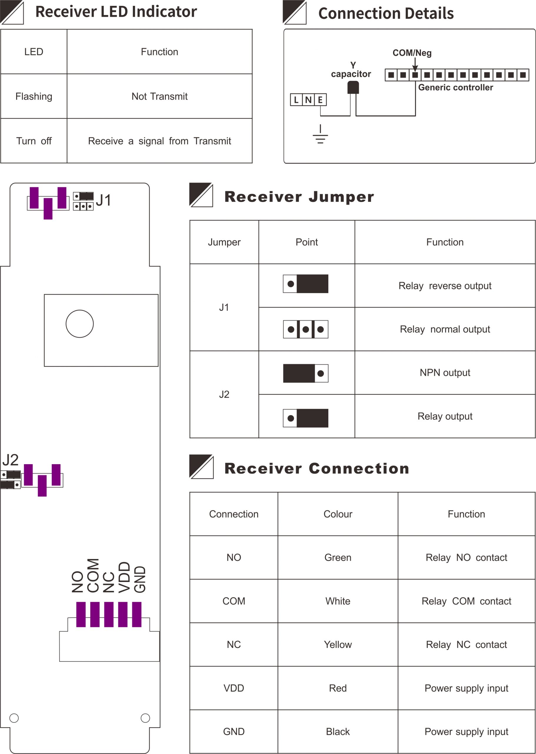 JUTAI IS-30R Wireless Rotate Type Photocell, the following figure is the detailed function setting of the receiving end, we can set the normally open signal or normally closed signal by setting the jumper cap, and the working status of the indicator can also clearly check the infrared beam working condition;