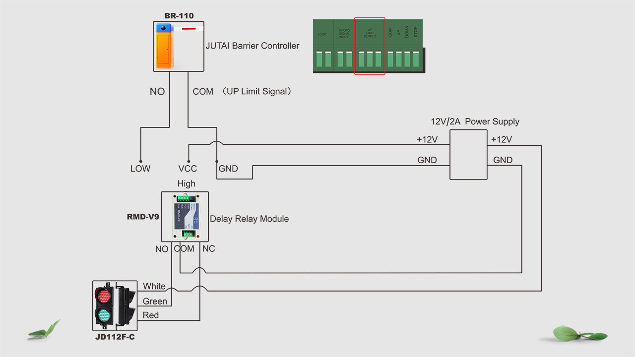 JUTAI BR-C intelligent barrier control panel has a perfect design. It has a Safety Loop Sensor Interface (with JUTAI LD-100), Safety infrared Photocell Interface (with Model IR-20), and Traffic Signal light Warning Interface ( with JD112HF-C), this Connection Details Shows how to connect JUTAI signal light, we only need to connect the light to three interfaces G.COM, R Port of BR-C Controller, and take Power Supply directly from the control board. no need for additional external power supply.