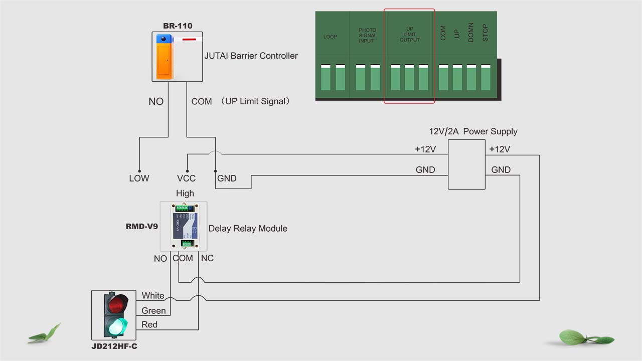 For the third part of barrier controller manufacturers, there is no specific signal light interface location, we need to use our signal light (12-24V) with the RMD-V9 delay relay conversion board, and prepare a separate power adapter with 12V power supply,connect to the corresponding interface of the barrier, realize the signal warning function.