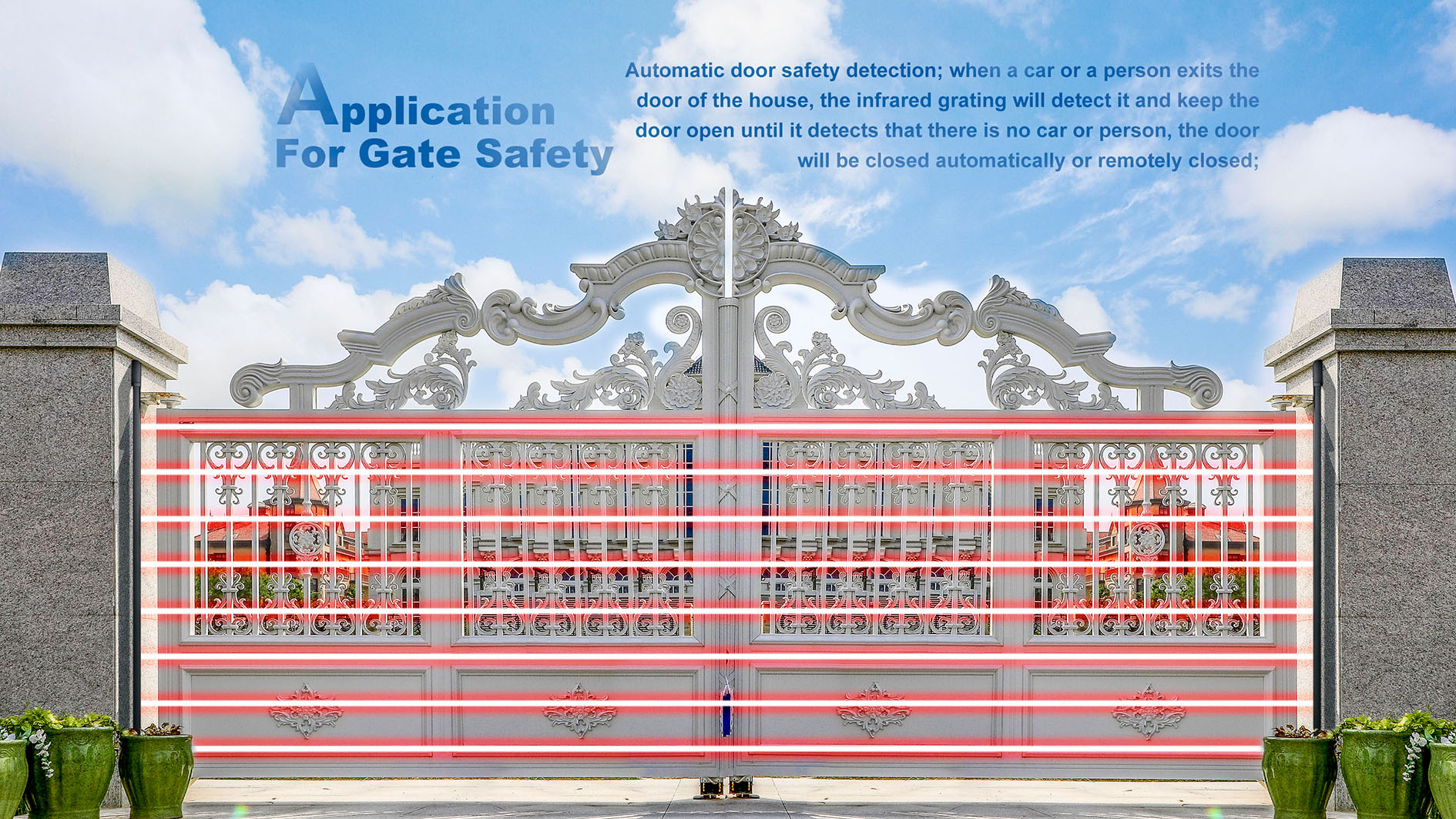 ◊ Automatic door safety detection; when a car or a person exits the door of the house, the infrared grating will detect it and keep the door open until it detects that there is no car or person, the door will be closed automatically or remotely closed.