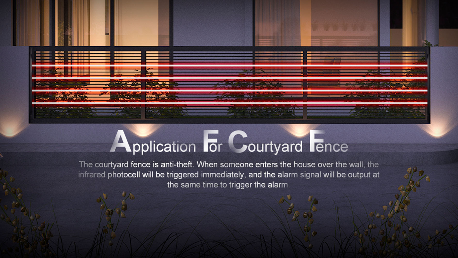 ◊ The courtyard fence is anti-theft. When someone enters the house over the wall, the infrared photocell will be triggered immediately, and the alarm signal will be output at the same time to trigger the alarm.