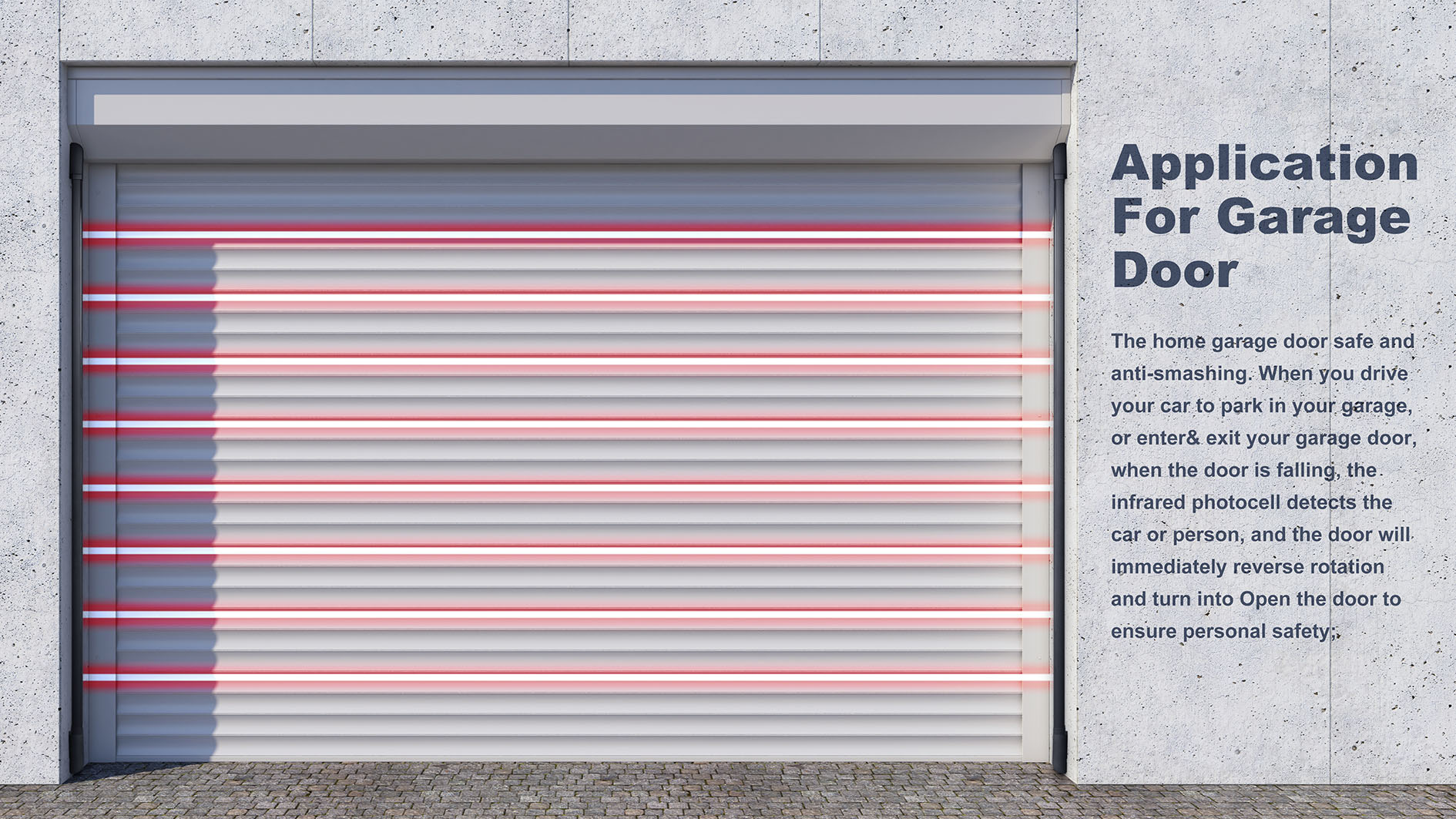 ◊ The home garage door safe and anti-smashing. When you drive your car to park in your garage, or enter& exit your garage door, when the door is falling, the infrared photocell detects the car or person, and the door will immediately reverse rotation and turn into Open the door to ensure personal safety.