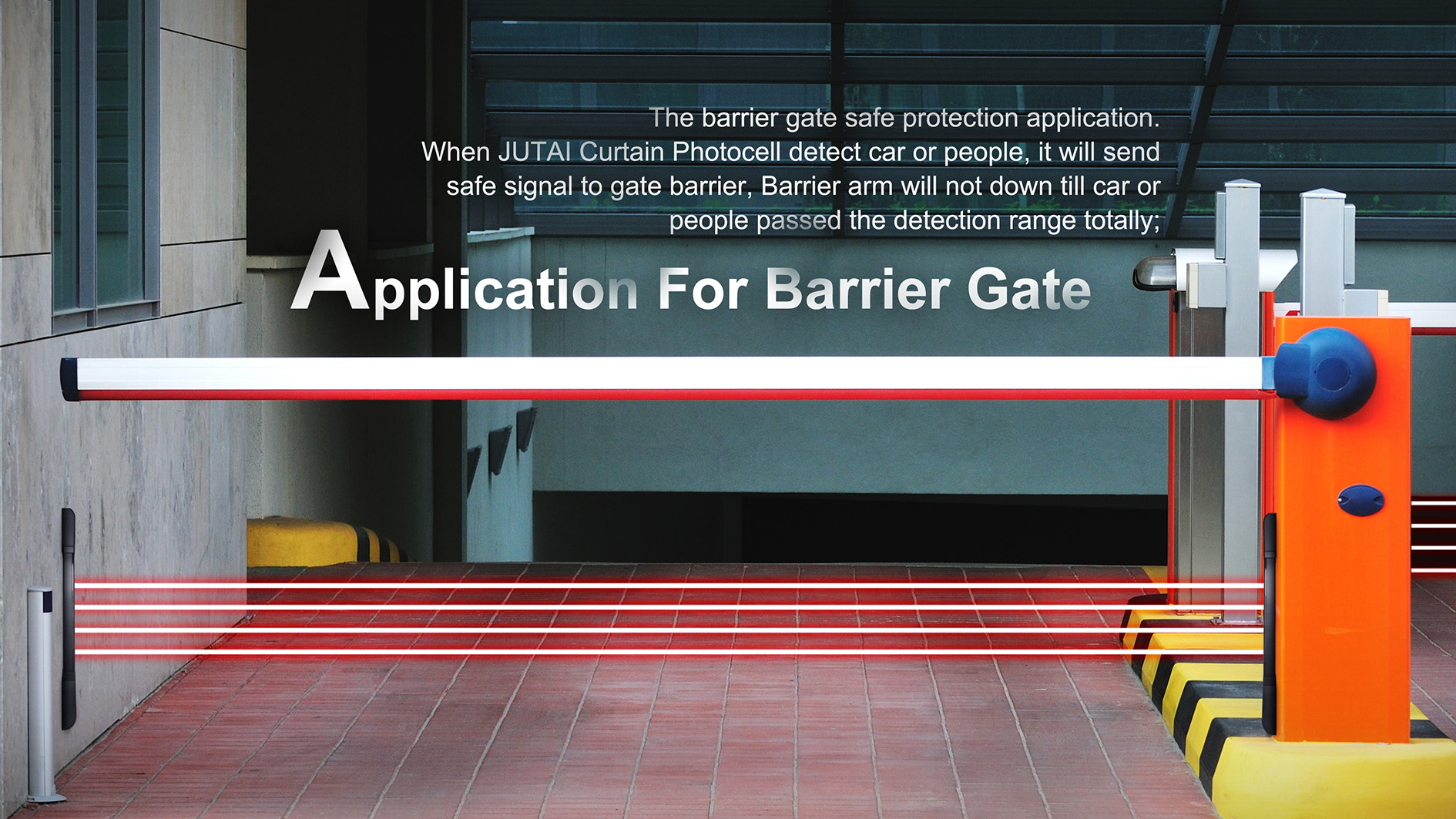When JUTAI Curtain Photocell detect car or people, it will send safe signal to gate barrier, Barrier arm will not down till car or people passed the detection range totally.