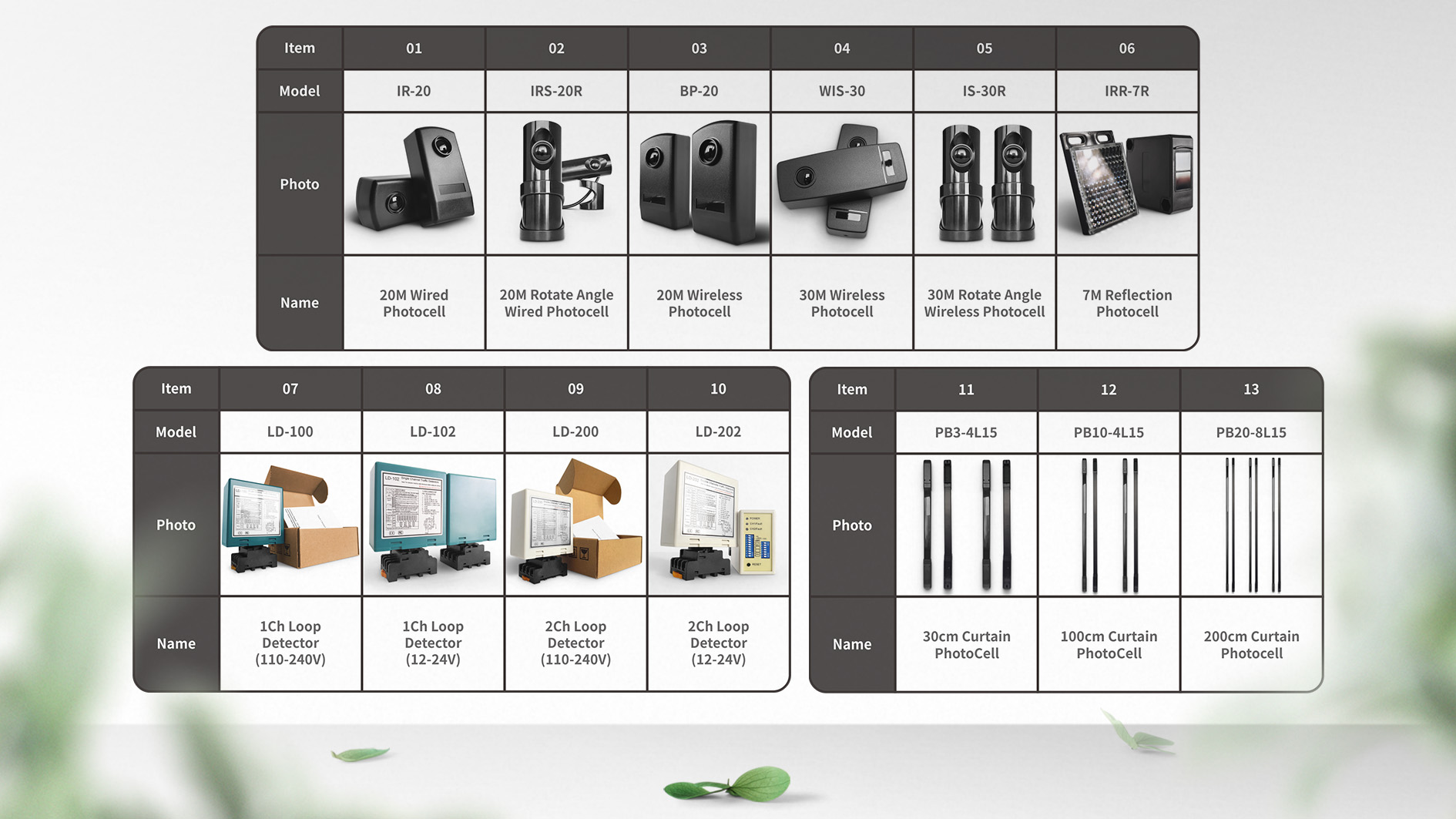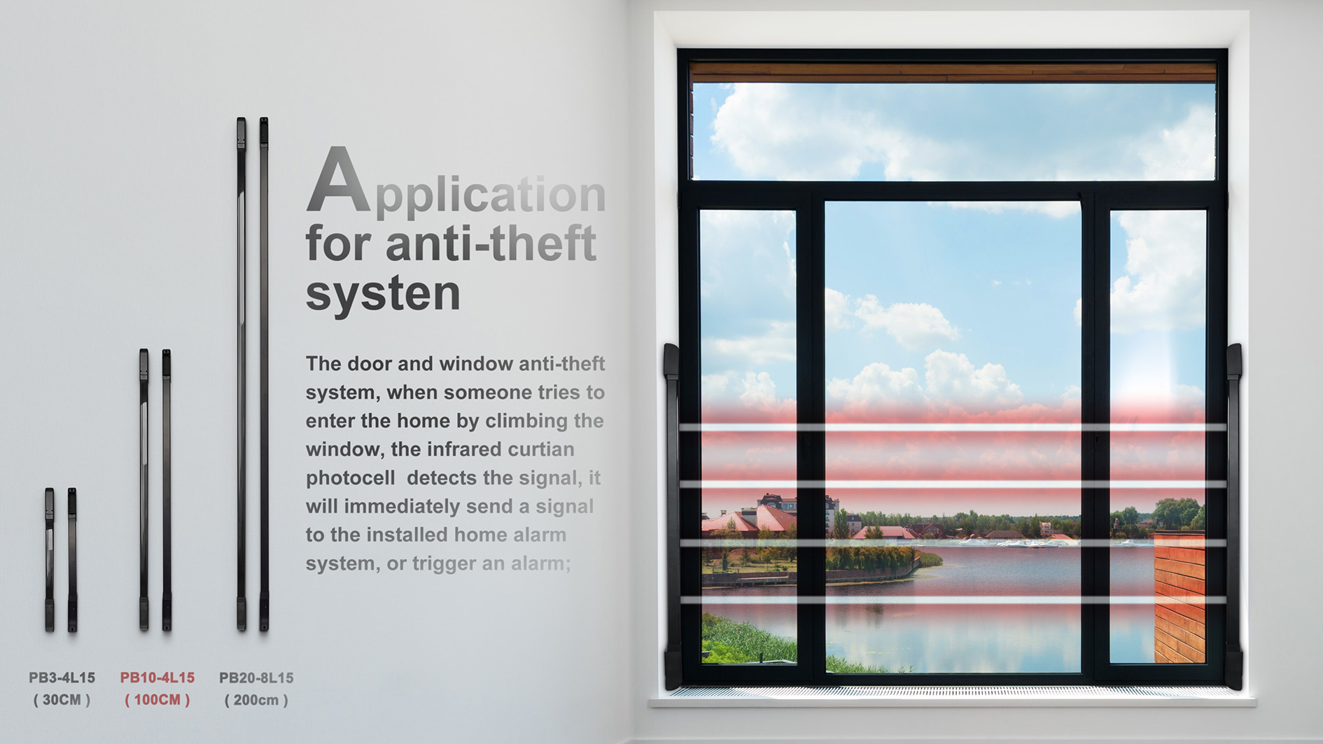 SHENZHEN JUTAI Curtain Photocell Products Group, which main including 3 size, PB3-4L15, 30CM height, inbuild 4 group infrared beams; PB10-4L15, 100CM height, inbuild 4 group infrared beams, PB20-8L15, 200cm height, inbuild 8 group infrared beams.